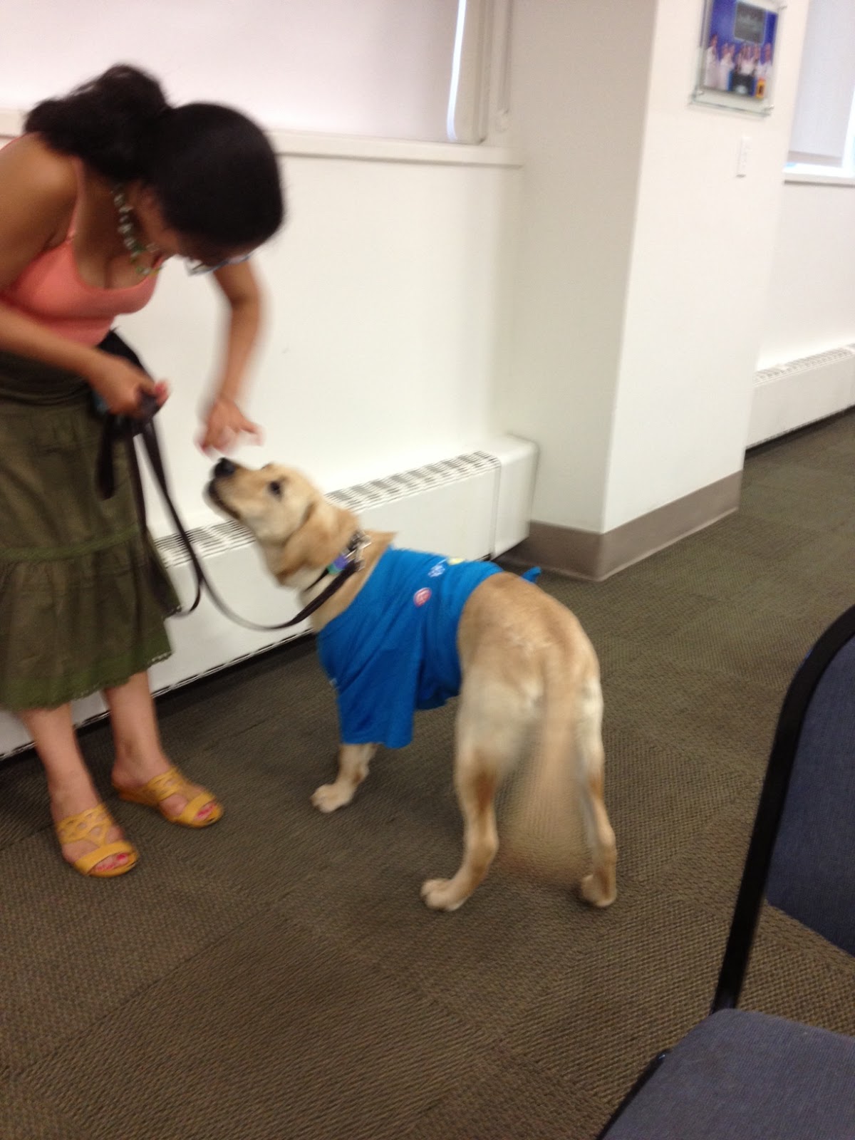 Tonight in puppy class I did not behave very well. It was a stressful evening. Mom locked the car and house keys INSIDE the car when we were preparing to leave, and our neighbor had to break into the car with a hanger. Surprisingly, it took about 10 minutes. Then, we went to class and although the entire fiasco took 20 minutes to resolve, I was only a few minutes late. I think all the commotion made me a bit snarky, though. As guide dogs, we must learn to tolerate wearing a harness, so as puppies we wear clothes to help us get used to wearing something other than our fur. I hate wearing this t-shirt. Below are my friends and classmates, Scooter and Georgie, wearing their shirts. I need to practice by playing dress up more at home.